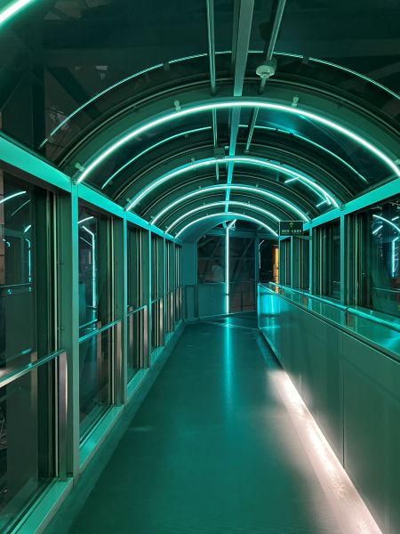 空中径路は京都駅ビルの10階部分にあってビルの西側と東側をつなぐ全長185mの空中廊下だそうです。